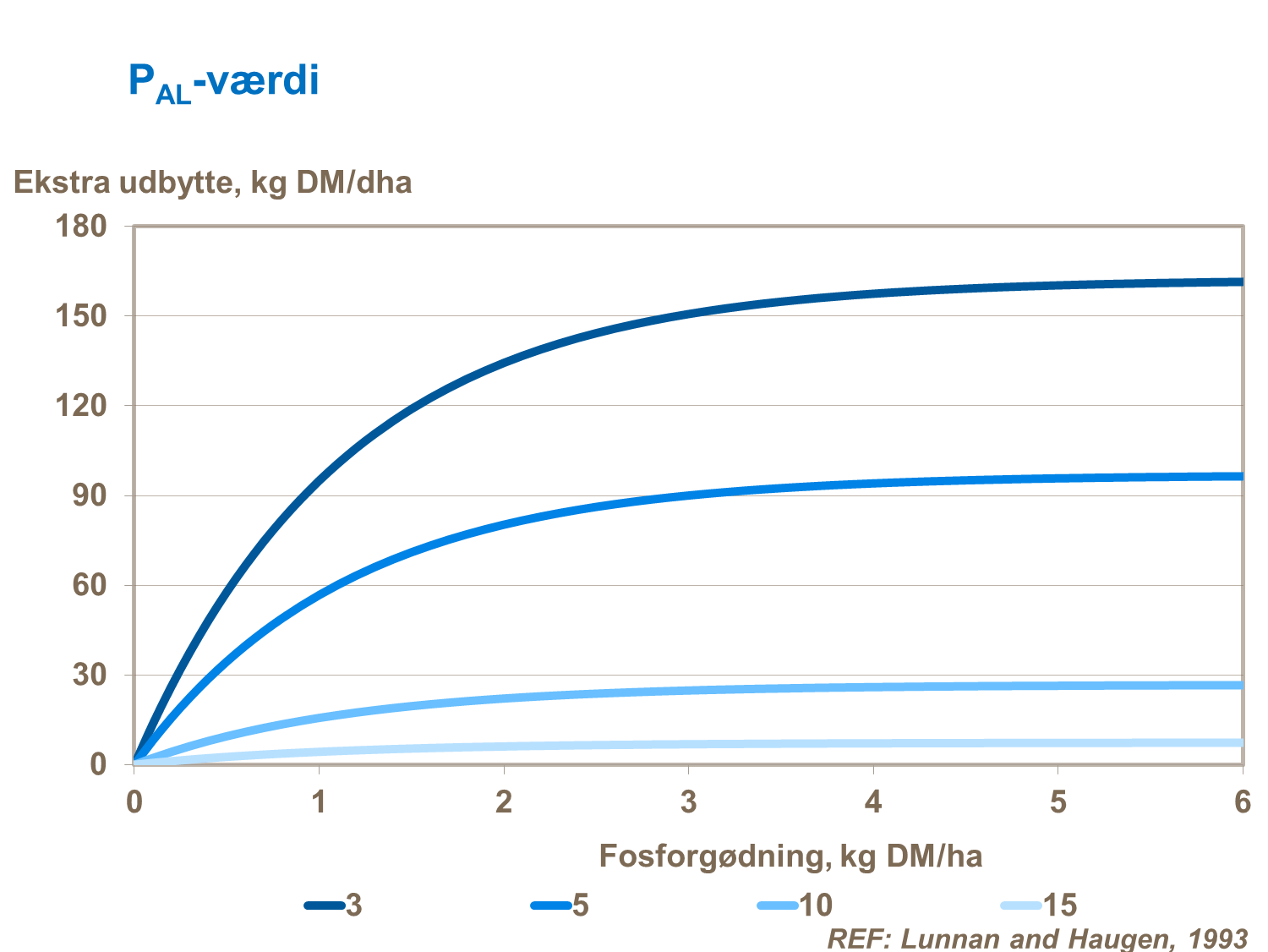 Responsen på fosfor afhænger af jordens status. Jorde med lav P-status giver bedre responser for tilført fosfor. Tilgængeligheden og mobiliteten af P er mindre specielt under kolde fugtige forhold i foråret. nHer har forsøg vist at forårstilført P giver bedre effekt selv på jorde med høj P-status. Disse data fra Norge viser P-responsen på jorde med forskellig P-status.