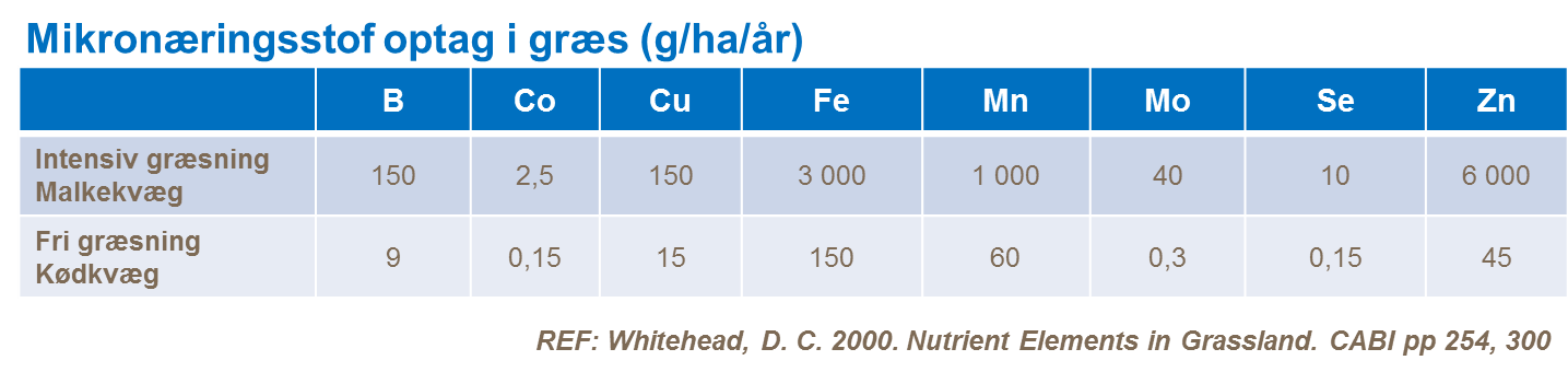 En afbalanceret gødningsstrategi er afgørende også selvom der er behov for mindre mængder mikronæringsstoffer. Det er yderst vigtigt at den rette balance mellem de forskellige mikronæringsstoffer, da det er afgørende for høje udbytter. De mest vigtige mikronæringsstoffer for græs er kobber, mangan og zink.
