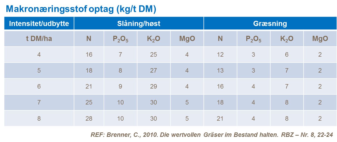 Kvælstof er det vigtigste næringsstof for græsudbyttet. Behovet for kalium, fosfat, svovl, calcium og magnesium er forbundet til mængden af anvendt kvælstof. Der er et stort behov for makronæringsstoffer ved tidlig forårsvækst og for at undgå at begrænse udbyttet, er det vigtigt at tilfredstillende mængder næring er tilgængeligt. Næringsoptaget og næringafgivelsen afhænger af produktionens intensitet samt om græsarealet benyttes til græsning eller høst.