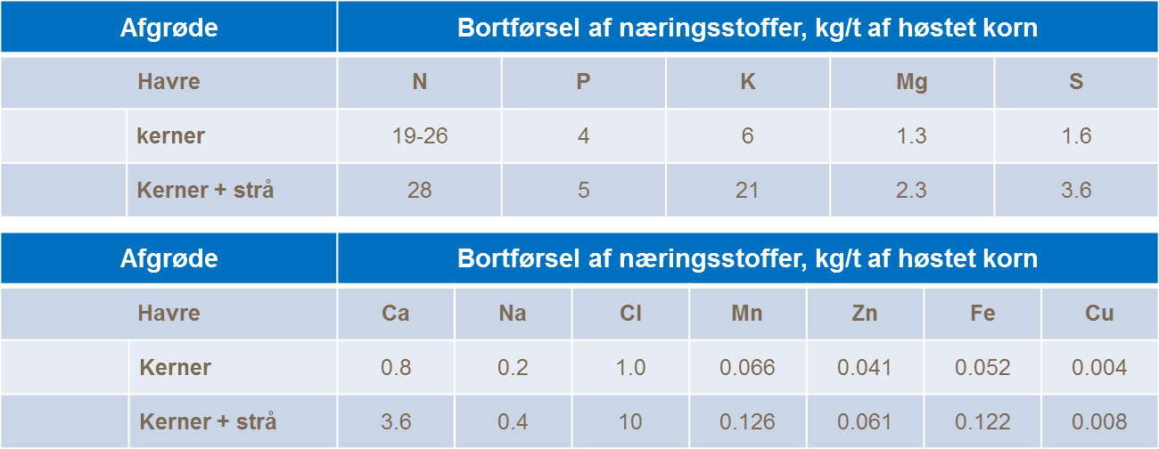 Med det omfattende rodnet som havren har, er den mere effektiv til at optage næringsstoffer fra jorden end andre kornsorter. Havren optager dog ikke ikke større mængder næring end andre kornsorter som f.eks hvede eller byg. Kvælstofanvendelse har en væsentlig påvirkning på havrens indhold af kvælstof, som ligger på mellem 1,9% og 2,6%. Derfor indeholder tørstoffet 19-26 kg/N pr. ton tørstof. Mængden af andre næringsstoffer varierer fra få kilo til få gram pr. ton tørstof.