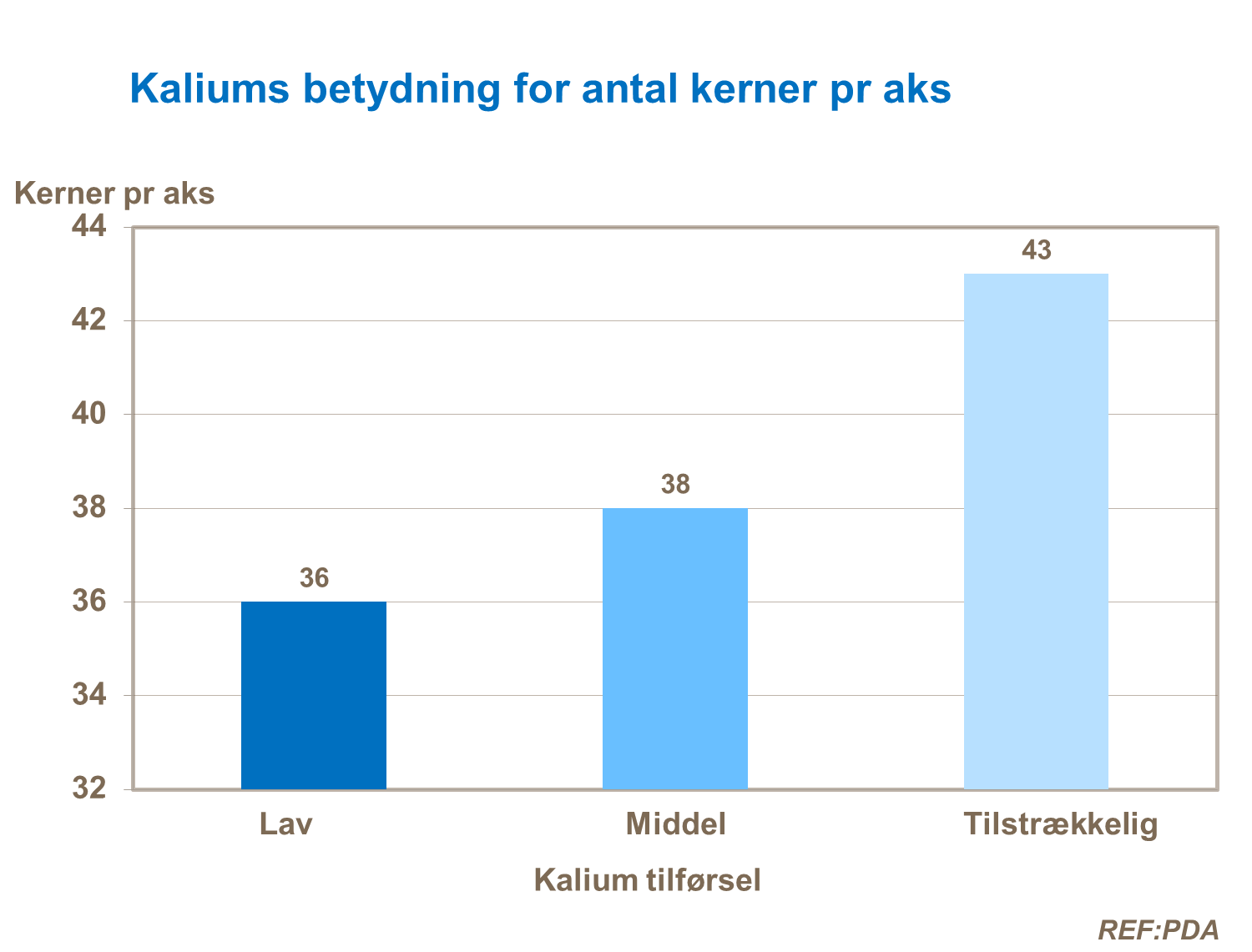 Dette studie fra PTA (Potash Development Association) viser klart og tydeligt sammenhængen mellem kalium tilgængeligheden og antallet af kerner pr. aks. Kaliumangel kan altså resultere i manglende kerneudvikling.