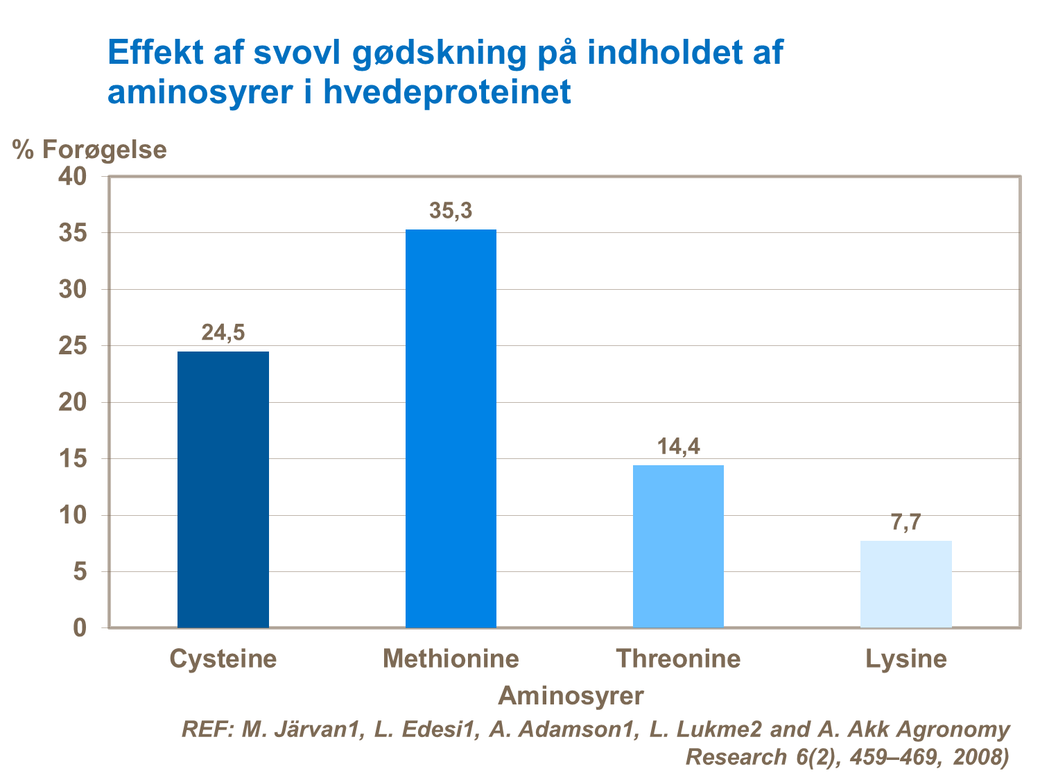 Svovl er en vigtig bestanddel i proteiner og er derfor vigtigt for proteinmængde og kvalitet. Derudover findes svovl I nogle af de aminosyrer der giver hvededejen dens bagningsevner. Eksempler på aminosyrer der indeholder svovl er: cystein, methionin, threonin og lysin.