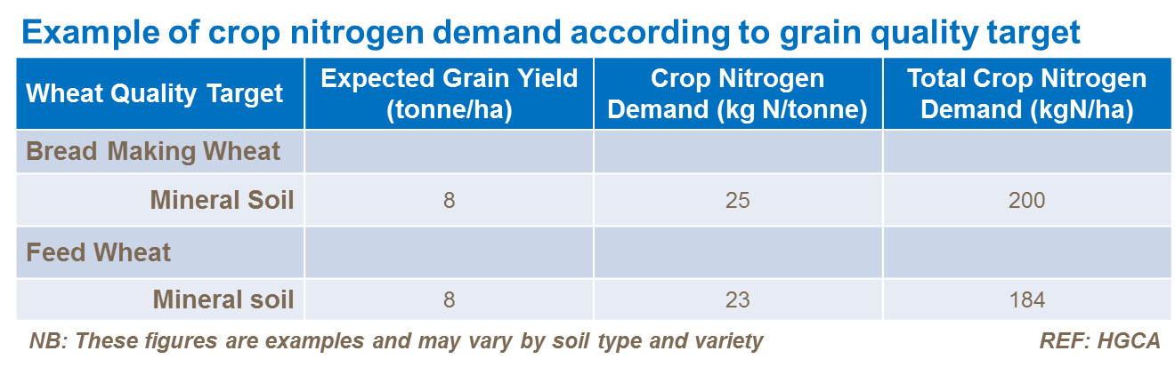 For at opnå et højere proteinindhold er det nødvendigt med mere kvælstof. Det totale kvælstofbehov for afgrøden er selvfølgelig et resultat af det ønskede udbytte samt proteinindholdet. Proteinindholdet med optimal N for udbytte i foder-hvede er konstant på omkring 11% (tilsvarende 1,9%N). I brød-hvede er det optimale omkring 12% protein og ofte er der behov for ekstra kvælstof for at opnå over 13%.