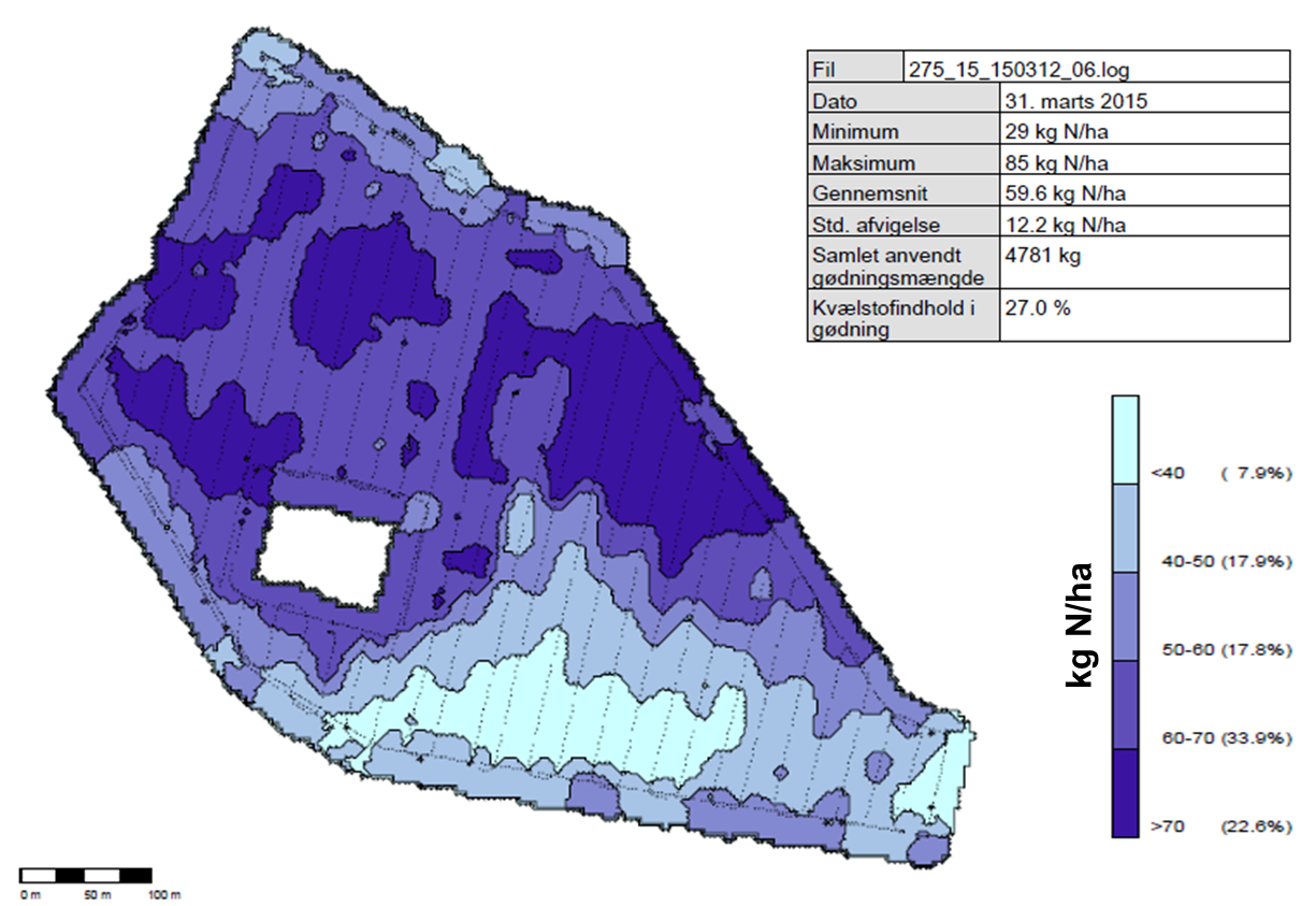 Baseret på målinger af koncentrationen af klorofyl og afgrøden tæthed, beregner Yara N-Sensor hvordan gødningen vil blive omfordelt for at optimere udbyttet og minimere risikoen for lejesæd i afgrøden. Kortet viser den anbefalede tildeling af kg N pr ha i forskellige steder af marken. Jo mørkere farve, jo mere kvælstof pr. ha. Den nordlige del af marken har generelt fået mest kvælstof.