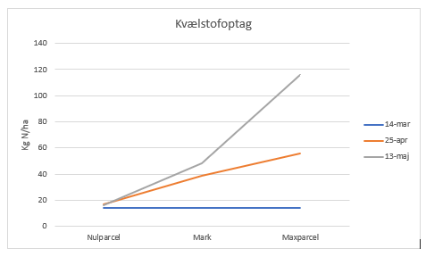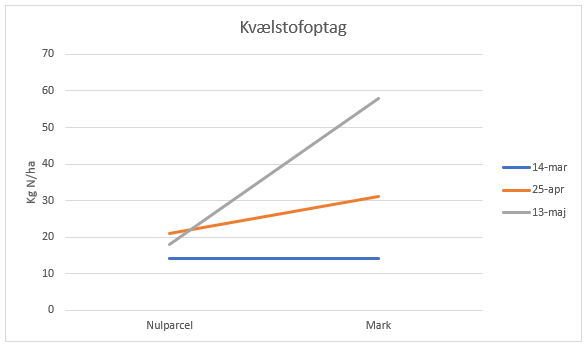 Her har været et godt optag af kvælstof i både mark og nulparcel siden første måling. Det tyder på en vis mineralisering, men også på en sulten mark med at godt potentiale for optag af kvælstof.