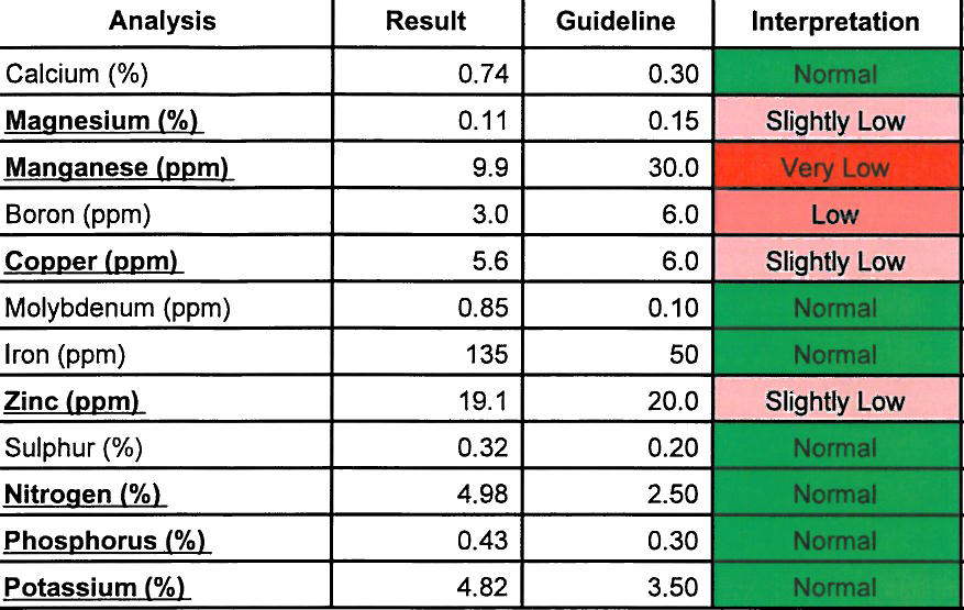 At disse tre næringsstoffer ofte er i underskud samtidigt skyldes at deres optag er påvirket af de samme faktorer, såsom tør jord og højt reaktionstal. Dette taler for at anvende blandinger af mikronæringsstoffer i stedet for at bruge produkter med kun et næringsstof. I alle disse analyser er der ikke påvist mangel på jern, så der er ingen grund til at tilføre jern.