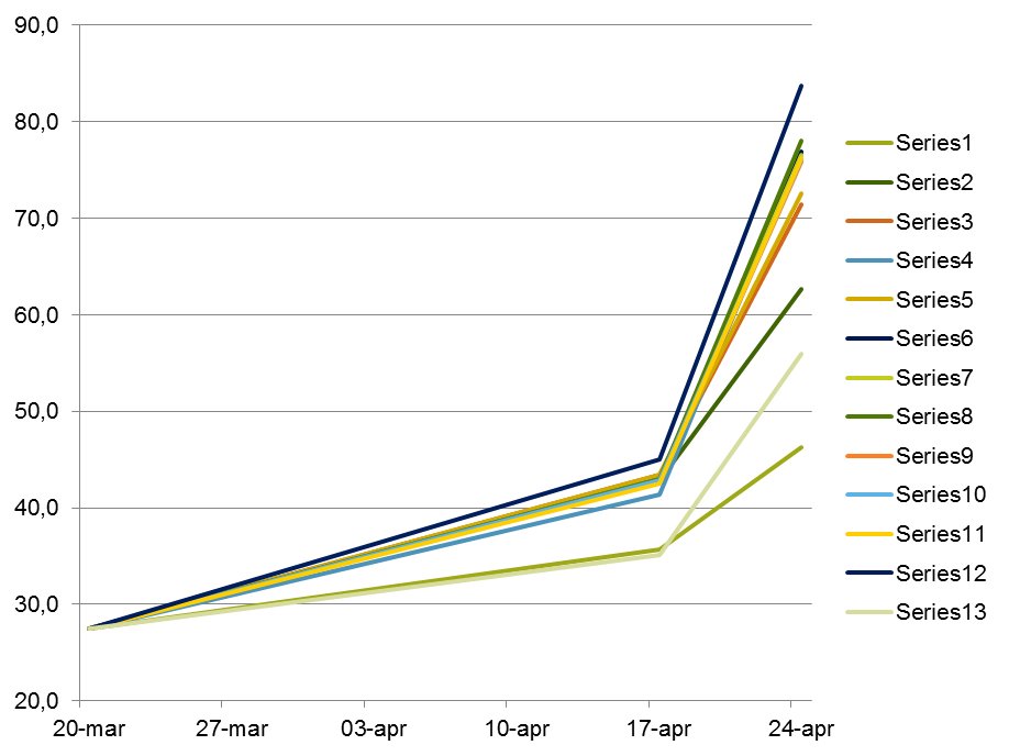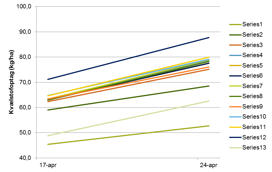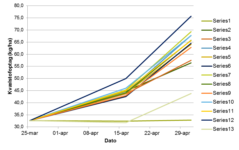 Kvælstofoptaget fortsætter trods det tørre vejr og er på de målte lokaliteter øget med 25 – 50% i de gødede parceller siden sidste måling i stadie 31. Der er tendens til at parceller, hvor der er tildelt mindre end 100 kg total kvælstof, nu på flere lokaliteter er begrænset af manglende kvælstof (serie 2-3 + 13). Det er til gengæld tydeligt at en kvælstofstrategi hvor hveden i marts blev startet op med 100 kg N fortsat er lykkes med et meget stort kvælstofoptag (serie 12). Der har på nuværende tidspunkt været en god udnyttelse af kvælstof tildelt tidligt. Parceller som i stadie 31-32 er gødet op til 150 kg N eller mere, har endnu ikke optaget det tildelte kvælstof og mangler endnu ikke kvælstof (serie 5-11).