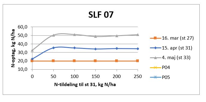Tredje måling af kvælstofoptaget er foretaget (P03- 24. april). Hveden er i stadie 32. Som det ses af figuren er kvælstofoptaget på denne lokalitet ikke begyndt. Første gødskning er udført 25. marts og anden gødskning er udført 15. april.