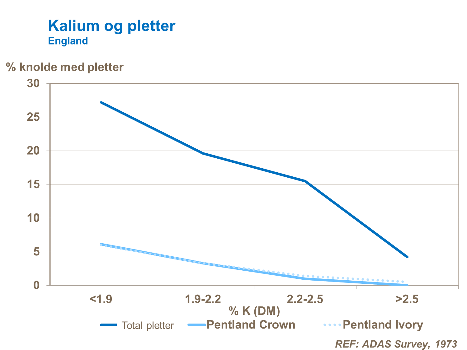 Kalium påvirker stødpletter og et øget kaliumniveau kan reducere mængden af knolde med stødpletter. Dette forsøg fra England viser sammenhængen mellem kaliumindhold og forekomster af stødpletter for en række forskellige kartoffelsorter. I forsøget herunder kan du se sammenhængen mellem kalium og stødpletter.
