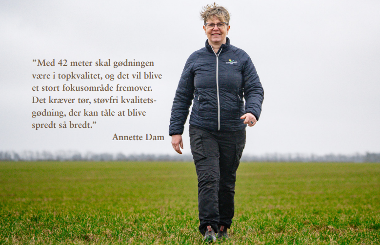 Den nye arbejdsbredde medfører også, at gødningen i fremtiden skal spredes på 42 meter, og det har givet anledning til nogle overvejelser. ”Vores gødningsspreder er klar til det, men gødningen skal også være det”, siger Gert Iversen, og Annette Dam fortsætter: ”Ja, man kan sagtens sprede en god gødning dårligt, men man kan ikke sprede en dårlig gødning godt.”