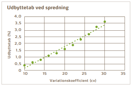 Den store udfordring er, at det ikke visuelt viser sig i marken, hvis din spredning ikke er optimal, før variationskoefficienten rammer 25 pct. Forskellen fra en variationskoefficient på 15 pct. kontra 25 pct. svarer til en forskel i udbyttet på ca. 1,5 pct., hvilket hurtigt kan løbe op i flere tusinde kroner.