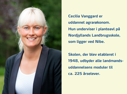 ”Vi har igennem flere år samarbejdet med mange af landbrugets leverandører omkring undervisning. Det er en god måde at få den nyeste viden og de nyeste produkter troduceret for eleverne på, og det giver generelt en god dynamik i undervisningen med forskellige gæsteundervisere. Vi betragter brugen af eksterne undervisere som et samarbejde til gavn for begge parter,” fortæller Cecilia Vanggard, Nordjyllands Landbrugsskole, der er uddannet agrarøkonom og har undervist landbrugsskoleelever i planteavl i 9 år.