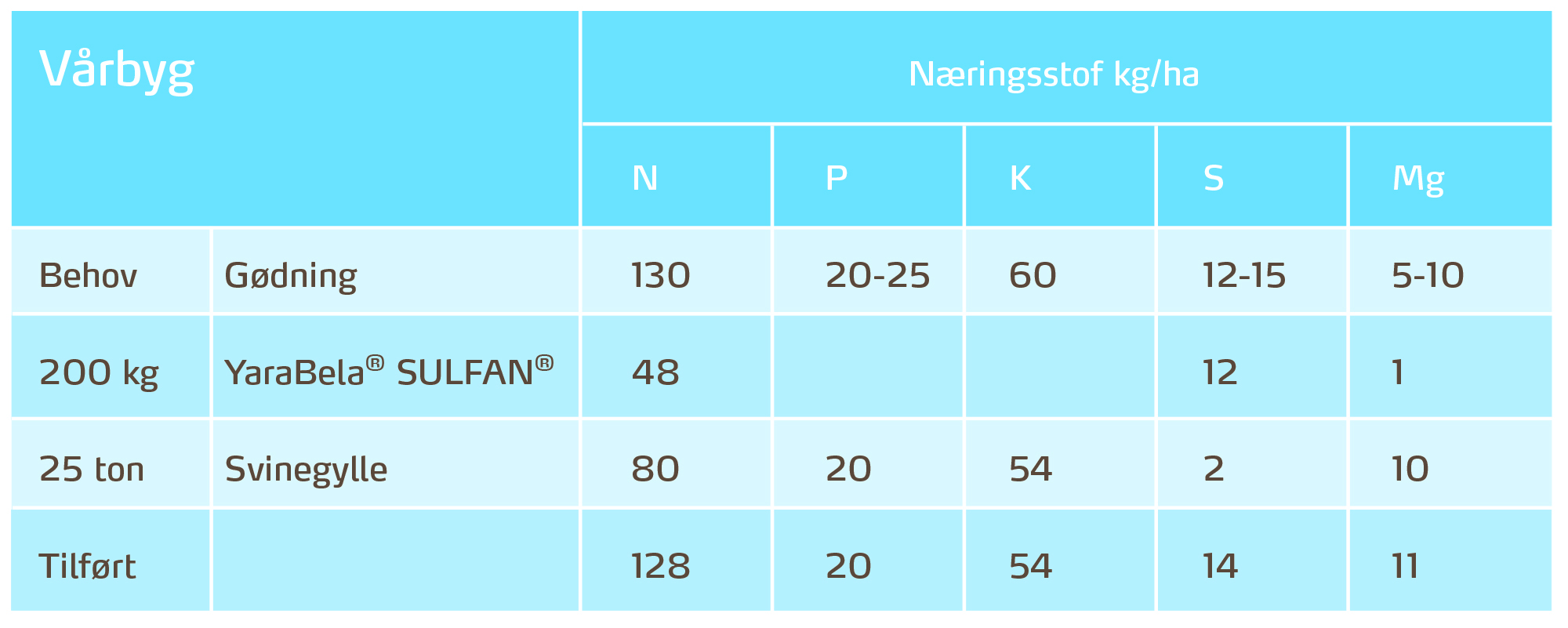 TABEL 2 - Gylletildeling er beregnet med 140 kg total N med indhold på 4 kg total N/ton og 80 % udnyttelse. Gylle indeholder svovl og magnesium, men det mineraliseres langsomt og kun en lille del er tilgængeligt i vækstsæsonen. Den sidste kvælstoftildeling med YaraBela SULFAN udføres ved begyndende skridning i stadie 37 og kan med fordel gradueres med Atfarm eller N-sensor.