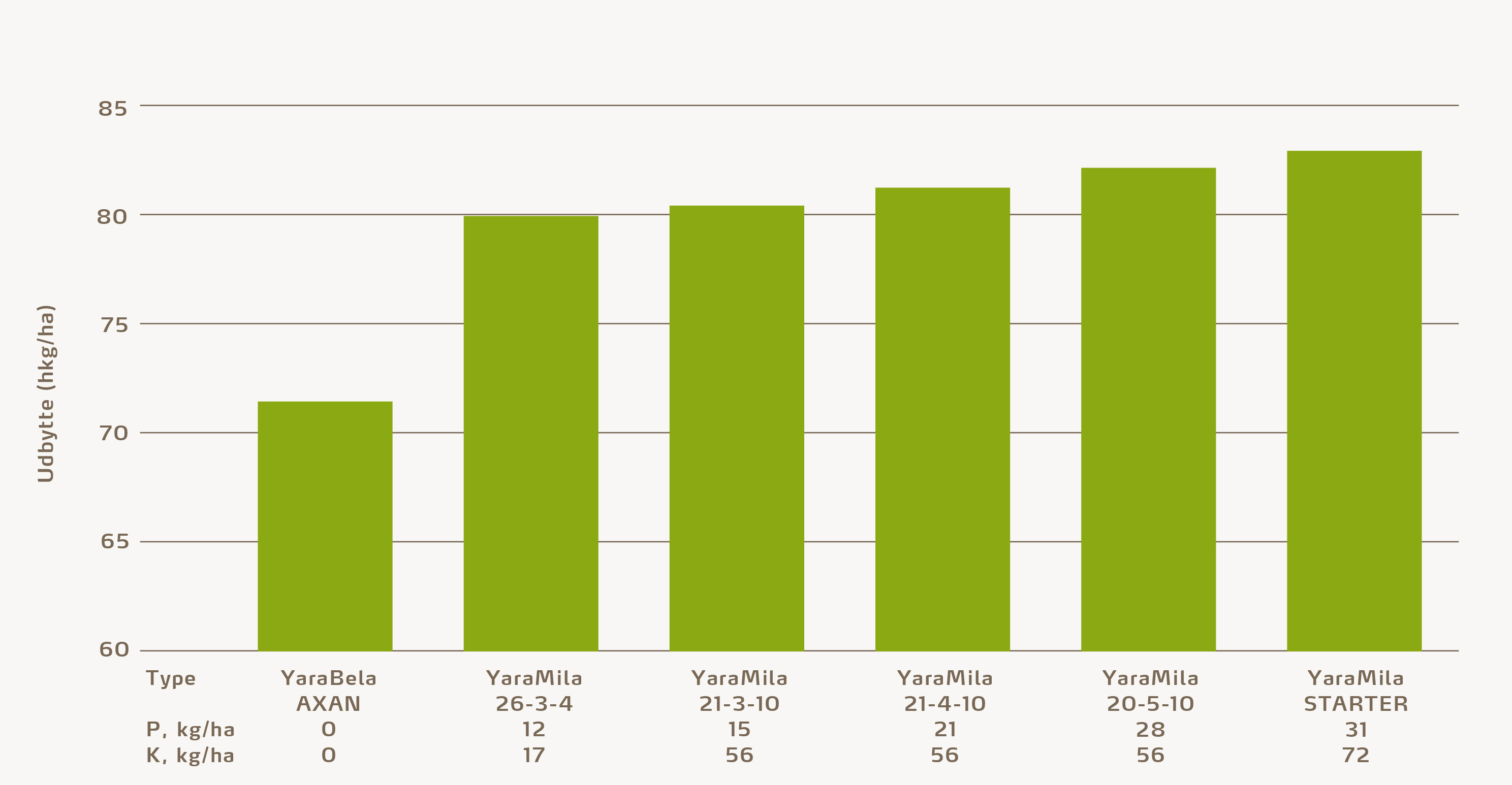 Stort merudbytte (op til 11,5 hkg/ha) for tilførsel af YaraMila. Med det opnåede udbytte på omkring 80 hkg pr. ha er der en samlet bortførsel i kerne og halm på cirka 27 kg fosfor pr. ha og ca. 100 kg kalium pr. ha. Derfor er det kun YaraMila NPK 20-5-10 og YaraMila STARTER, der tilfører nok fosfor til, at der ikke tæres på jordens indhold.