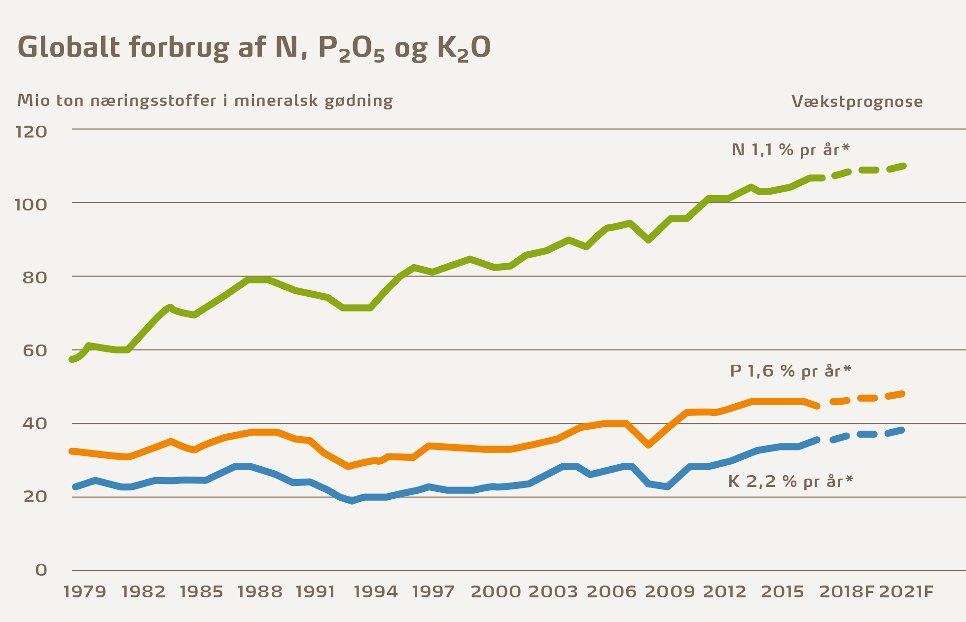 FIGUR 1 - Globalt gødningsforbrug målt i rene næringsstoffer. Med lidt årlige udsving har der været et støt stigende forbrug. Kilde: IFA, juni 2017.