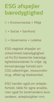 ”Landmandens økonomi har altid været den væsentligste del af kreditindstillingen, når landmanden skulle låne penge. Men det er i fremtiden ikke nok. Nu kommer bæredygtighed og klimaindsats til at spille en stadig større rolle”. Det fortæller Rasmus Gøther Frost, der er specialist i bæredygtighed på Kompetencecenter Erhverv i Jyske Bank. Og det er her, at ESG kommer ind i billedet. ESG er en samlebetegnelse for bæredygtighedsforhold, og står for Environmental (miljø), Social (samfund) og Governance (ledelse)"