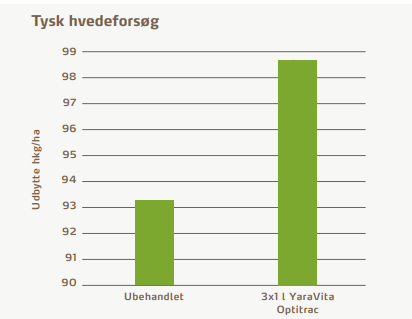 I en af demoerne blev der 9. juni givet 2 l YaraVita Optitrac pr. ha i hvert andet spor. Selvom der ikke var visuel forskel, udløste behandlingen et merudbytte på 2,1 hkg/ha.