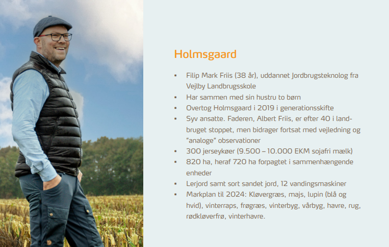Filip Friis driver, sammen med sin hustru og syv ansatte, Holmsgaard, som er en økologisk bedrift beliggende i Sønderjylland. Siden han overtog gården i 2019 har han udvide og justeret bedriften bl.a. er malkekobesætningen fornyet med jerseyracen, og der eksperimenteres med nye afgrøder samt formaling og toasting af disse, så selvforsyningen af mineraler til de nu 300 jerseykøer kan øges.