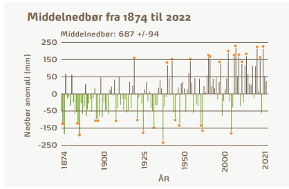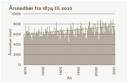 I gennemsnit er nedbøren siden 1874 steget med ca. 11 mm pr. årti frem til i dag, hvor de ekstreme nedbørsår – de mest våde år alle på nær ét – var at finde i sidste halvdel af perioden mellem 1948 og i dag. To tredjedele af de mest regnfattige år var at finde i første halvdel af tidsperioden mellem 1874 og 1948.
