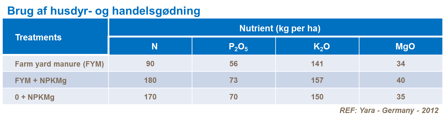 Det er vigtigt at overveje brugen af husdyrgødning, når et gødskningsprogram tilrettelægges for afgrøderne. Næringsunderskud skal undgås og forsøg viser klare responser for anvendelse af gødning sammen med husdyrgødning.