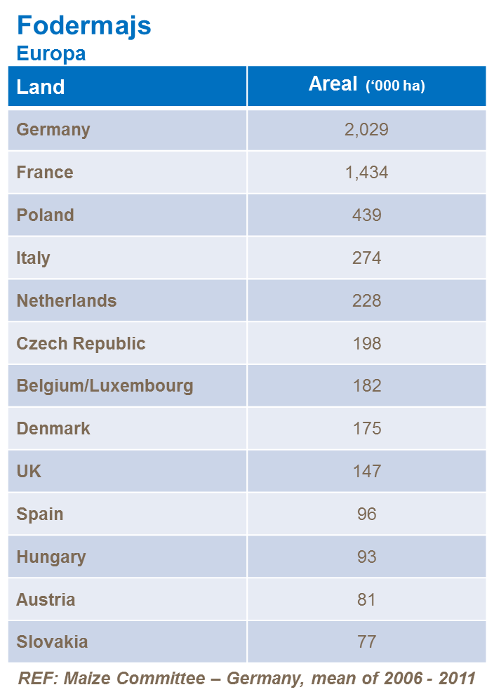 I Europa produceres der årligt silomajs på ca. 5 millioner hektar og kernemajs på et tilsvarende areal. Tyskland og Frankrig er førende i produktionen.