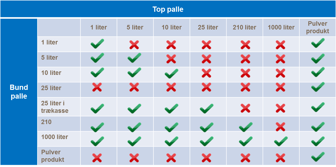 Brug en gaffeltruck eller en palleløfter når du aflæsser dine YaraVita produkter. Sørg for at udstyret kan klare den vægt som lasten har. Undgå at dele pallerne med håndkraft for at aflæsse leverede produkter og sørg for at den beskyttende ompakning ikke er beskadiget ved aflæsning. Lad ikke pallerne stå udenfor efter aflæsning. Paller skal opbevares i rækker. Hvis det ikke er muligt at stille pallerne på rækker, så sørg for at følge retningslinjerne for stabling af paller.