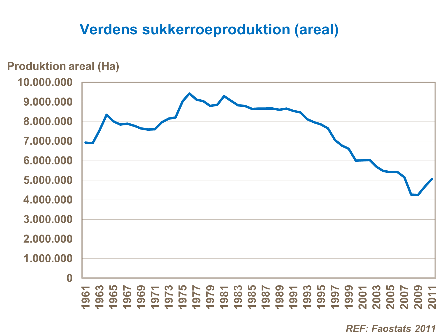 Det dyrkede areal med sukkerroer har vist en nedadgående trend over tid med arealet på 73% i forhold til 1961.