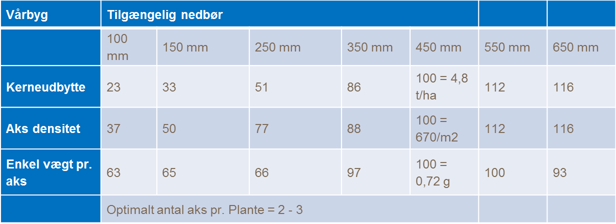 Herunder i tabellen ses hvordan udbyttet bliver påvirket af den tilgængelig mængde nedbør. Disse simple forhold er grundlaget hvorfra vi udvikler vores agronomiske principper inden for dyrkningen af vårbyg. For at kunne indsamle strålingen skal vi udvikle en tilpas stor bladmasse af sunde grønne blade til at indfange 90 % af den indkommende stråling. Bladmassen skal holdes grøn og sund til kernefyldningsfasen. Derfor er der to særlige mål: