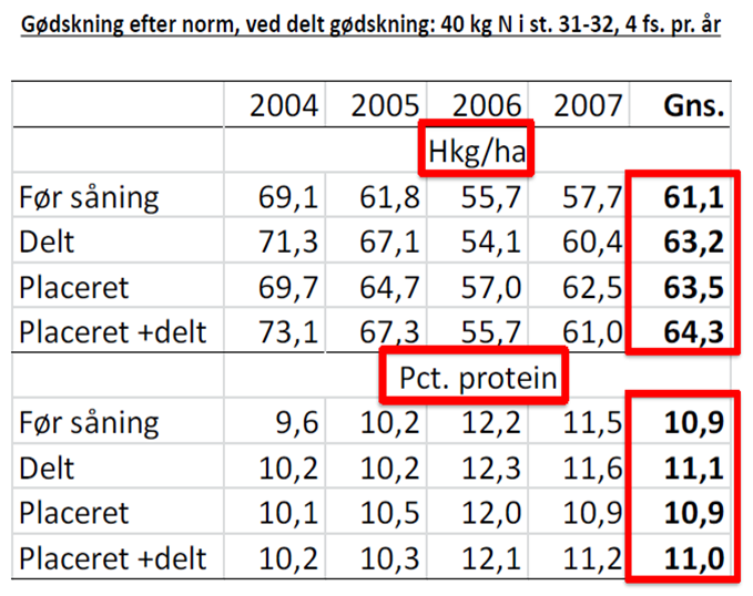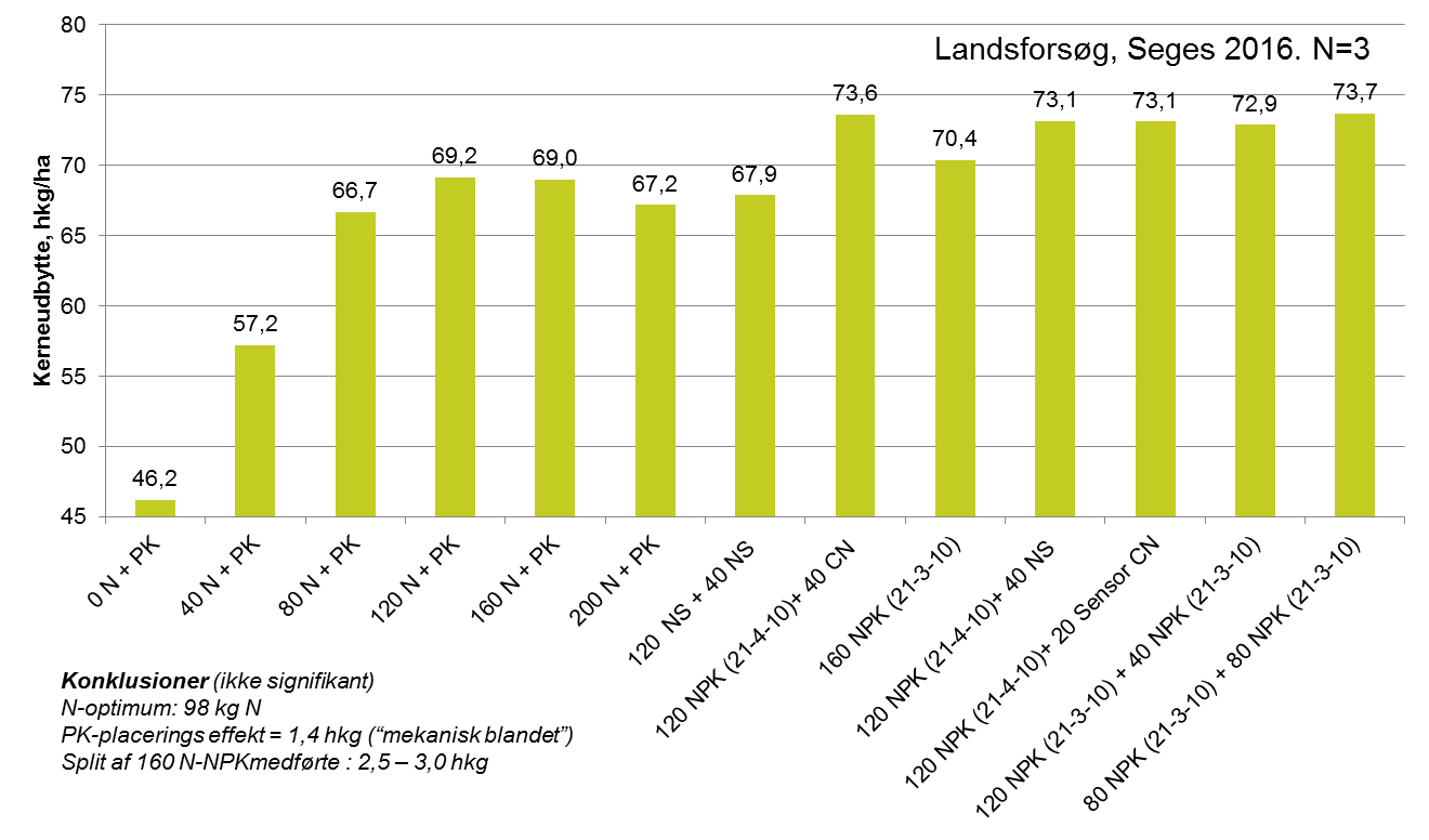 De første 6 forsøgsled er udført som stigende kvælstoftildeling, hvor N er placeret, mens P og K er bredspredet før såning. Sammenlignes 160 kg N+PK med 160 kg NPK, ses der et merudbytte på 1,4 hkg ved at bruge en samgranuleret NPK gødning.