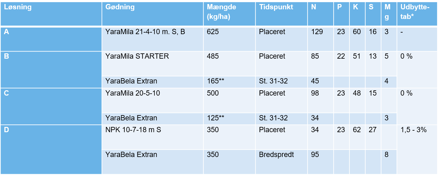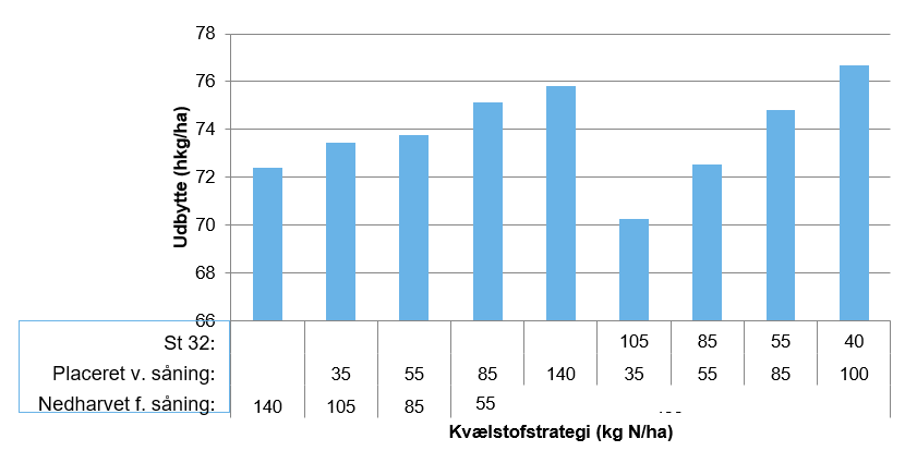 Det er kun placering af 85 kg N i NPK-gødning suppleret med 55 kg kvælstof bredspredt i såbedet, som er på niveau med placering af hele gødningsmængden. Det er altså vigtigt at der placeres en stor mængde kvælstof ved såning.