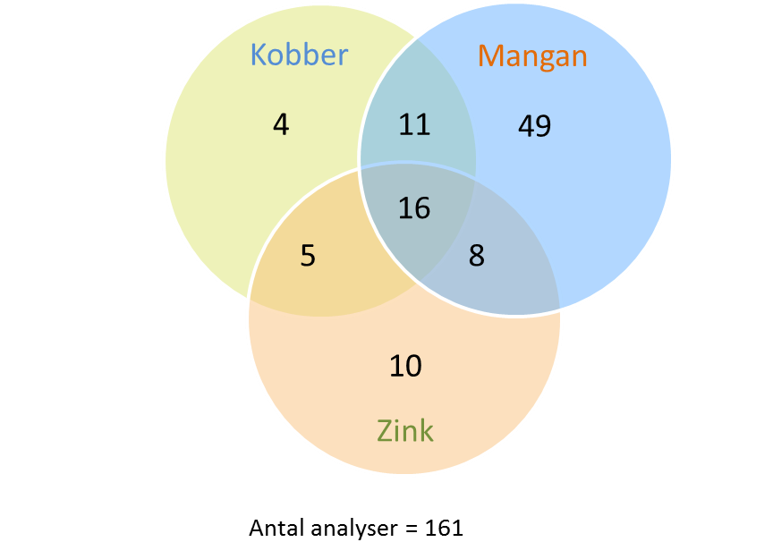 Ud af de 161 planteprøver af byg, som blev sendt ind i 2016, var indholdet under grænseværdien på 7 ppm, i 36 af disse. Altså i 22 % af prøverne har der været en mulighed for at udbyttet ville have været højere, om der havde været tilført kobber til afgrøden. Interessant nok har indholdet i disse prøver også været underoptimalt for enten zink eller mangan i langt de fleste tilfælde. Dette kan ses i diagrammet nedenfor, som viser 161 prøver udtaget i 2016.