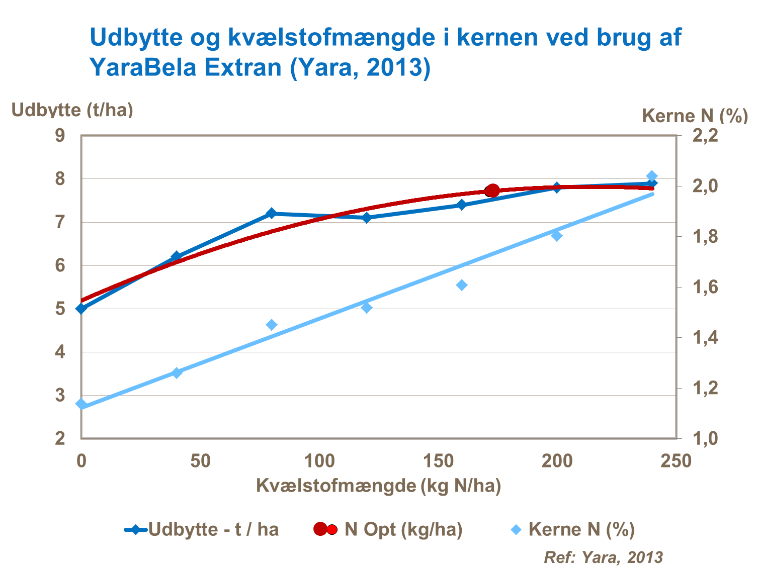 Ved at vente med kvælstofanvendelse til sidst på sæsonen vil man opnå et højere kvælstofindhold i kernen. Ved dyrkning af vinterbyg til foder kan anvendelsen af kvælstof være højere og foregå senere for at opnå et højere proteinindhold.
