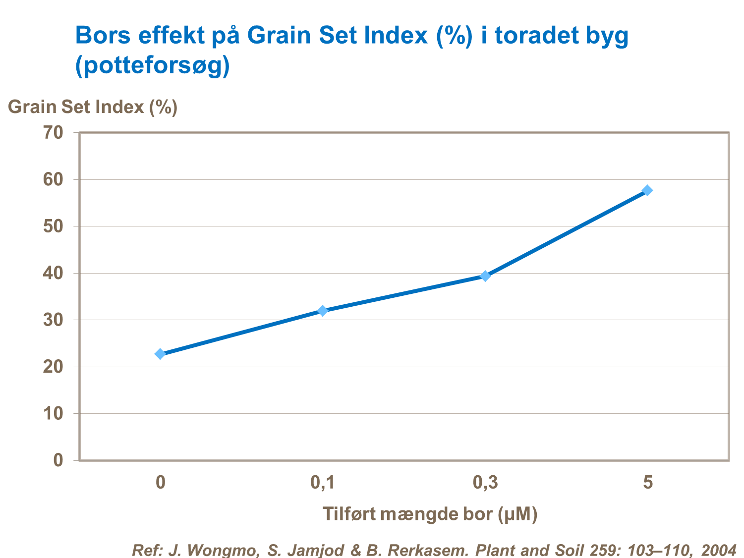 Bor har en veldokumenteret effekt på pollens overlevelsesevne og bormangel kan derfor føre til en reduktion i antallet af kerneanlæg per aks. En måleenhed som benyttes til at observere effekten af bor, er “Grain Set Index” som viser andelen af dannede kerner i forhold til antallet af blomster ved blomstring i procent. Et højt ”Grain Set Index” er målet, da dette vil føre til flere kerner per aks/ sideskud.